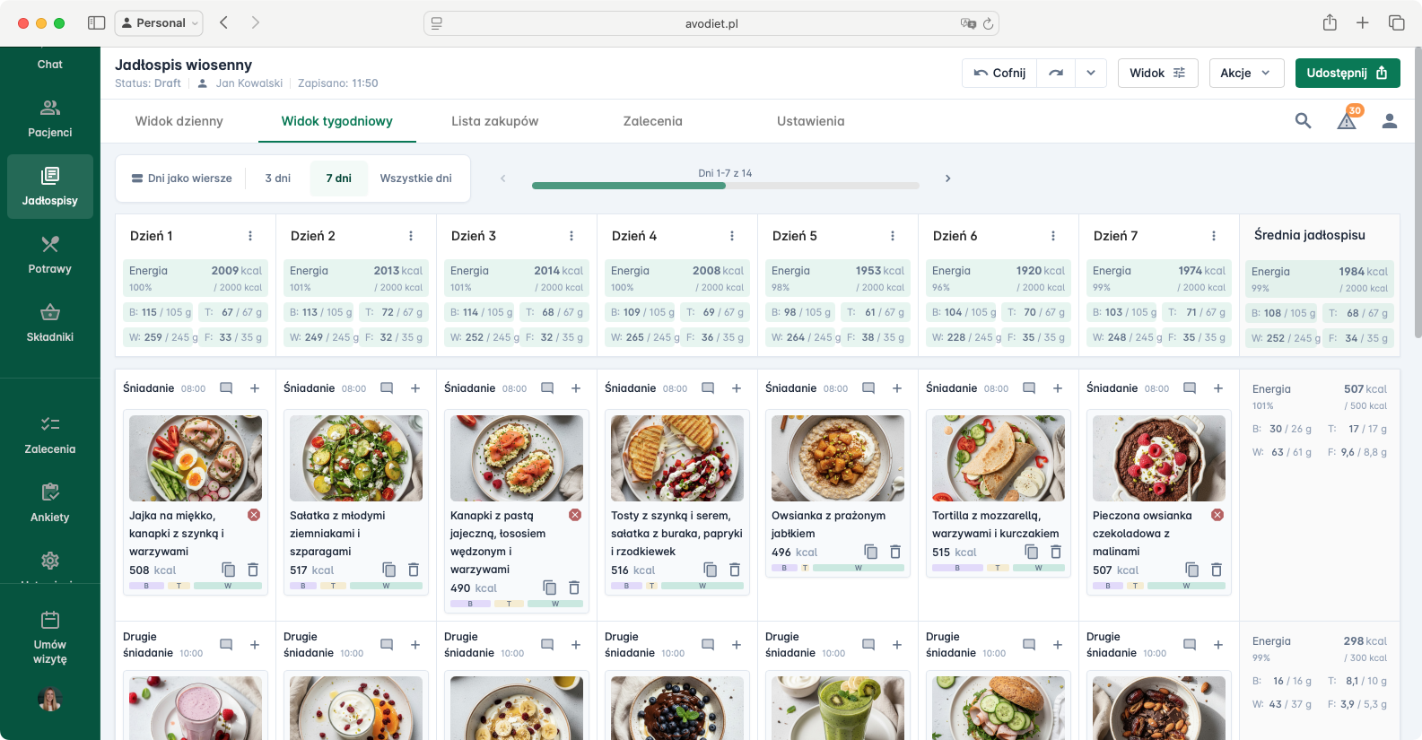 Jedna platforma z kreatorem jadłospisów, aplikacją mobilną dla pacjentów i czatem. Darmowy 14-dniowy okres testowy bez ograniczeń.